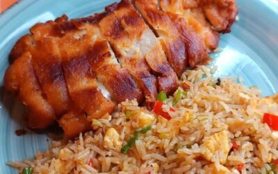 Gebackene Hühnerbrust mit gebratenem Reis Dieses Rezept kombiniert knusprig gebackene Hühnerbrust mit aromatischem gebratenem Reis – ein einfaches, aber unglaublich…
