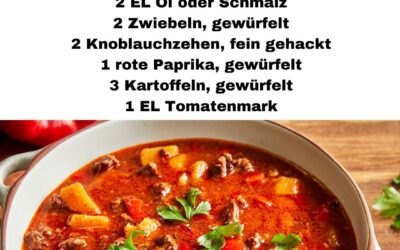 Gulaschsuppe mit Kartoffeln nach ungarischer Art Zutaten (für ca. 4–6 Portionen)500 g Rindfleisch (z. B. Rinderschulter oder Wade), gewürfelt2 EL…