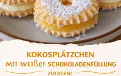 Kokosplätzchen mit weißer Schokoladenfüllung Zutaten: Für den Teig: 200 g Butter, weich 120 g Puderzucker 1 Päckchen Vanillezucker 1 Prise…