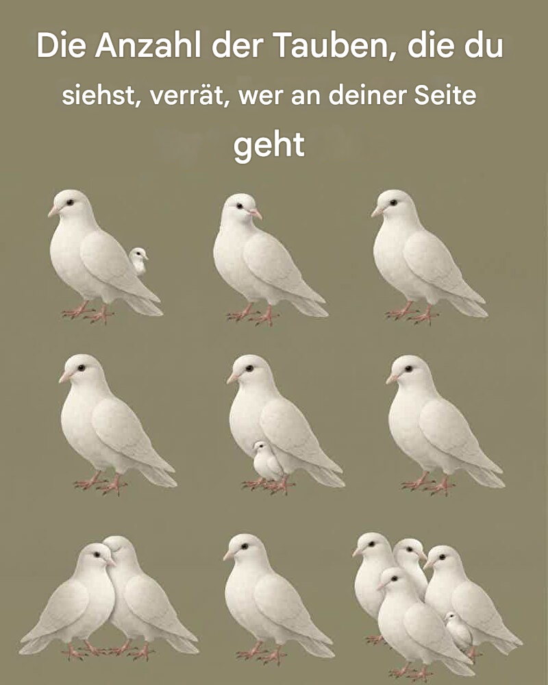 Seit Jahrhunderten symbolisieren Tauben Frieden, Liebe, Schutz und spirituelle Präsenz. In vielen Kulturen gelten sie als Boten – als Brücke zwischen der physischen und der unsichtbaren Welt. Wenn man also gefragt wird, wie viele Tauben einem zuerst auffallen, ist das mehr als nur eine Beobachtungsübung. Es wird zum Spiegel der eigenen inneren Welt.