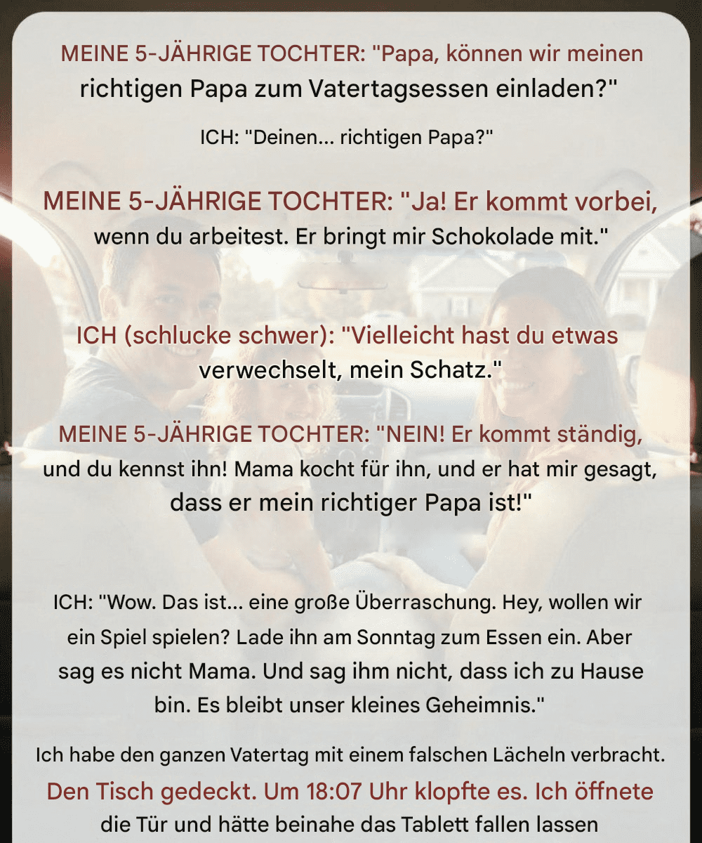 Es klang nach so einer seltsamen, unschuldigen Sache, die Kinder manchmal sagen, ohne die Tragweite ihrer Worte zu begreifen. Wir fuhren gerade vom Kindergarten nach Hause, als sie plötzlich fragte: „Papa, können wir meinen richtigen Papa am Vatertag zum Essen einladen?“