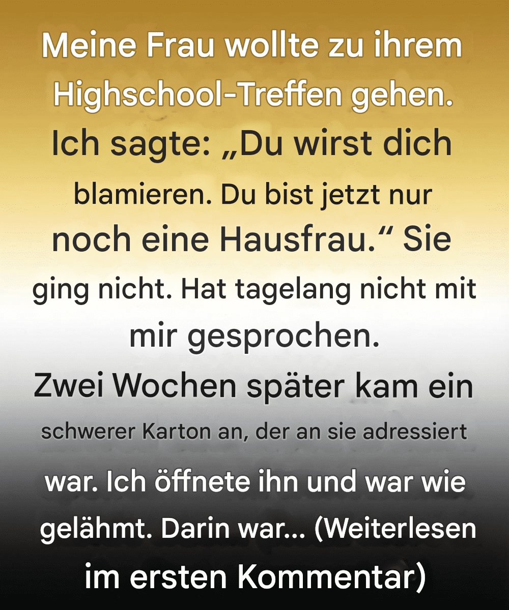 Sie stand in der Küchentür, das Licht fiel auf den Rand der Einladung in ihren Händen. Ihr Lächeln hatte etwas Hoffnungsvolles, Sanftes – etwas, das ich erst richtig erkannte, als es verschwunden war. Ohne nachzudenken, ohne Grausamkeit, aber voller Arroganz, sprach ich.