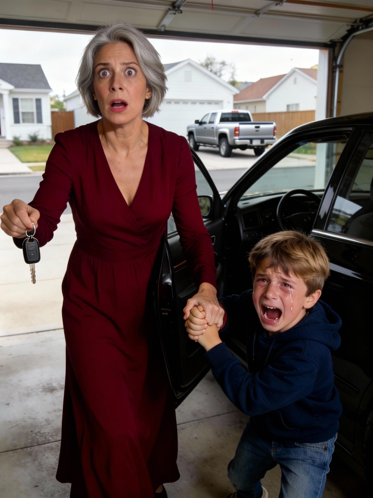 Sie hatte gerade die Autotür geöffnet, als das Garagentor gegen die Wand knallte. Ihr Enkel Lucas kam angerannt, blass und atemlos.