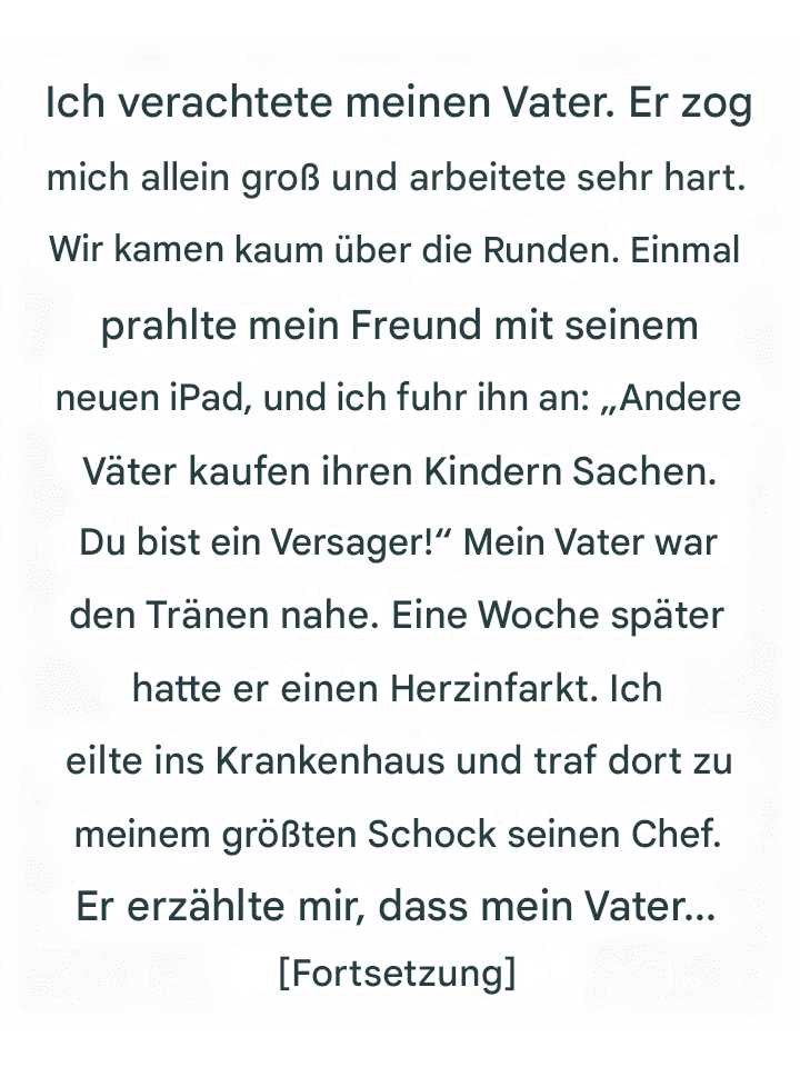 Ich rannte zitternd durch die Krankenhaustüren, meine Brust schnürte sich vor Angst und Reue zusammen. Während ich im Flur saß und auf Neuigkeiten wartete, meine Worte immer wieder durchging, kam ein Mann auf mich zu. Er stellte sich als der Vorgesetzte meines Vaters vor.