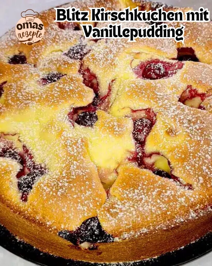 Hier ist das Rezept für diesen himmlischen Blitz Kirschkuchen mit Vanillepudding: