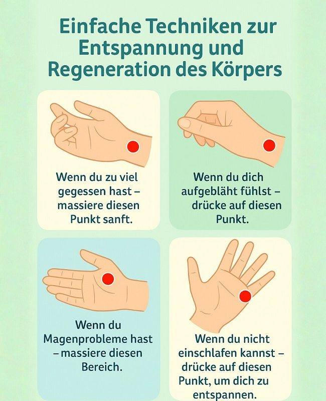 Ich habe diesen Punkt entdeckt, als ich nach einem großen Familienessen (Kartoffelsalat, Braten, Rotkohl – das volle Programm) auf dem Sofa saß und dachte, mein Bauch platzt gleich. Ich erinnerte mich an ein altes Buch meiner Tante über „Heilende Hände“ – und dort war genau dieser Punkt beschrieben. Fünf Minuten Massage – und ich konnte wieder tief atmen.