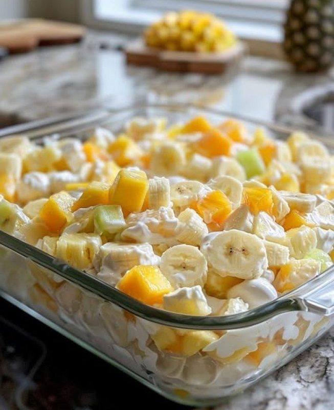 Es gibt Gerichte im Leben, die sind nicht einfach nur Rezepte. Sie sind kleine Zeitreisen. Sie tragen uns zurück in Momente, die längst vergangen sind, in Küchen, die es vielleicht gar nicht mehr gibt, zu Menschen, die wir geliebt haben und die uns geprägt haben, oft ohne dass sie selbst wussten, wie sehr. Manche Gerichte sind wie Schlüssel — man nimmt einen Löffel, und plötzlich öffnet sich im Herzen eine Tür, durch die Licht und Wärme strömen, ein vertrauter Duft, ein Gefühl von Zuhause. Und genau so ist es bei diesem Obstsalat, den meine Großmutter jedes Jahr gemacht hat. Wann immer die kalten Monate vorbei waren und die ersten wärmeren Tage kamen, wenn die Sonne sich länger zeigte und der Garten wieder lebendig wurde, gab es diesen Obstsalat — frisch, farbenfroh, süß, cremig und voller Liebe.