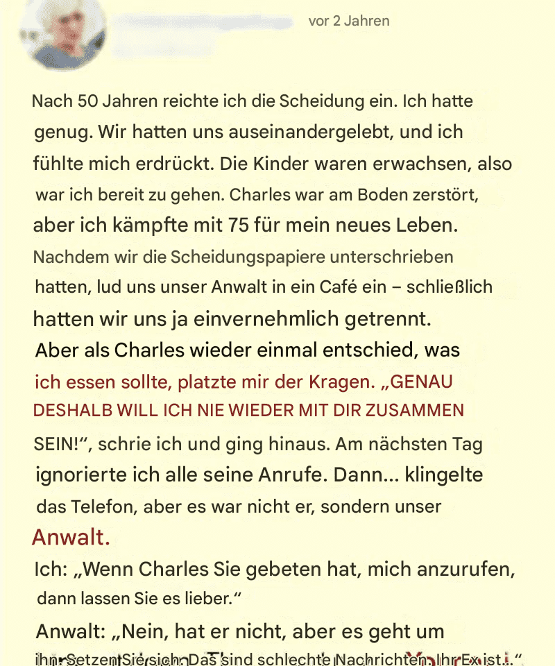 Charles war am Boden zerstört, aber ich kämpfte mit 75 für mein neues Leben. Nachdem wir die Scheidungspapiere unterschrieben hatten, lud uns unser Anwalt auf ein Café ein, und wir beendeten die Angelegenheit schließlich einvernehmlich.