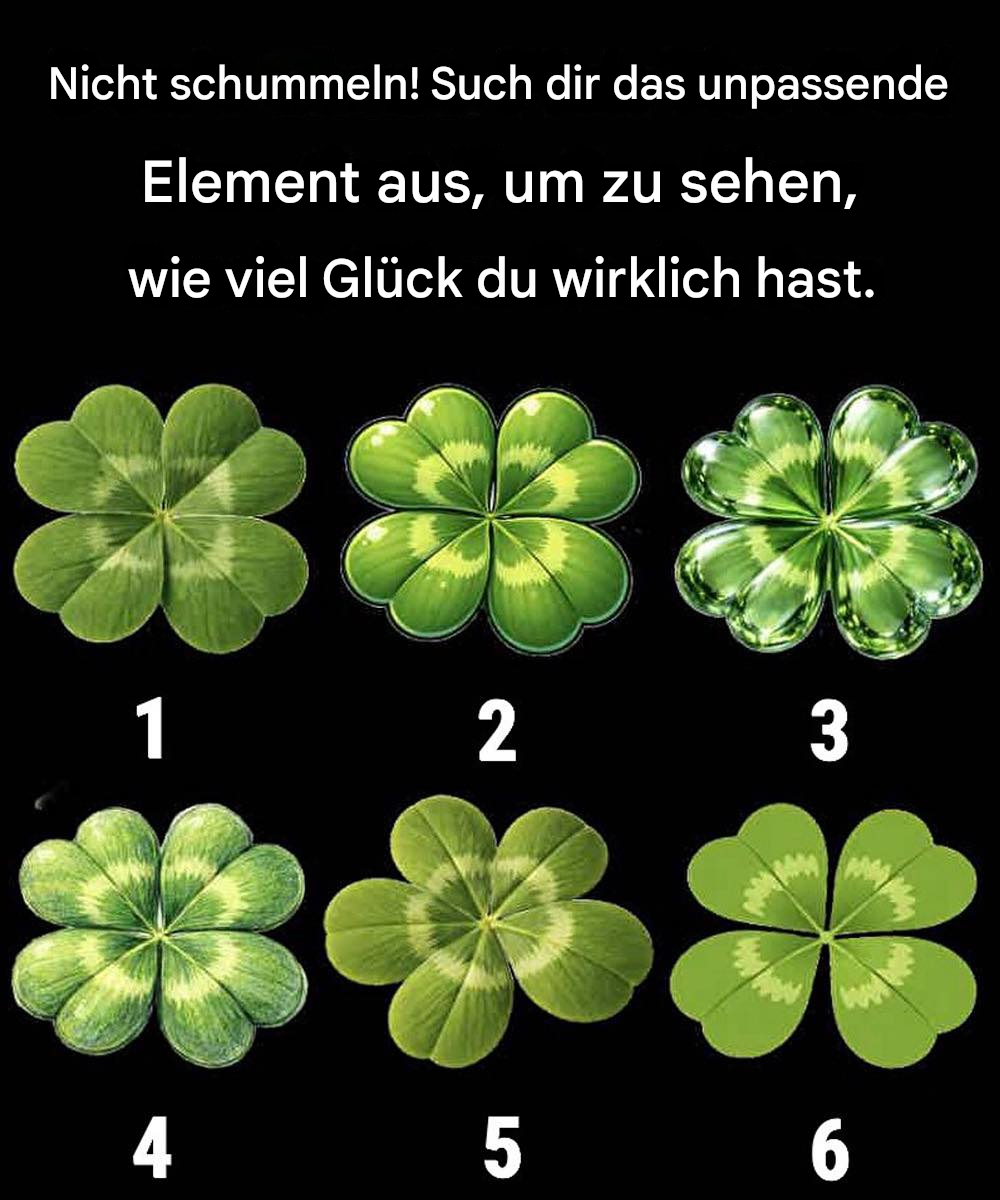 Auf den ersten Blick wirkt das Bild wie ein simples Spiel: sechs Kleeblätter, jedes ein wenig anders, und eine Aufgabe – das unpassende Kleeblatt zu finden. Doch hinter diesem spielerischen Test verbirgt sich etwas viel Faszinierenderes. Es geht nicht wirklich um Glück … sondern um Wahrnehmung, Intuition und Persönlichkeit.