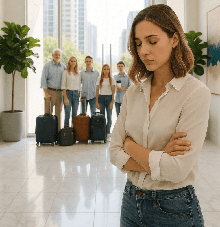 Als ich öffnete, blieb mir der Mund offen stehen. Draußen stand die ganze Familie meines Mannes – seine Mutter, seine beiden jüngeren Schwestern, sein jüngerer Bruder und dessen Frau. Alle trugen Taschen und Koffer und strahlten vor Freude.