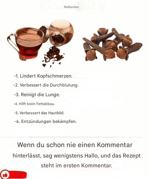 Zubereitung: Wasser zum Kochen bringen, Nelken hinzufügen und 5 Minuten köcheln lassen. Zugedeckt 10 Minuten ziehen lassen, dann abseihen. Nach Belieben süßen und heiß genießen.