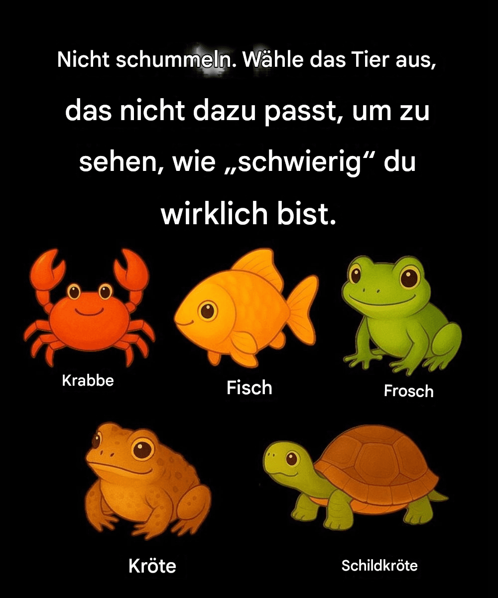 Du gehörst zu den Menschen, denen strukturelle Unterschiede sofort auffallen. Die Krabbe sticht hervor, weil sie Scheren, zusätzliche Beine und eine völlig andere Körperform als die anderen hat. Im Gegensatz zu Fröschen, Schildkröten, Kröten und Fischen, die alle einen länglichen, zweigeteilten Körper besitzen, sieht die Krabbe fast kreisförmig aus.