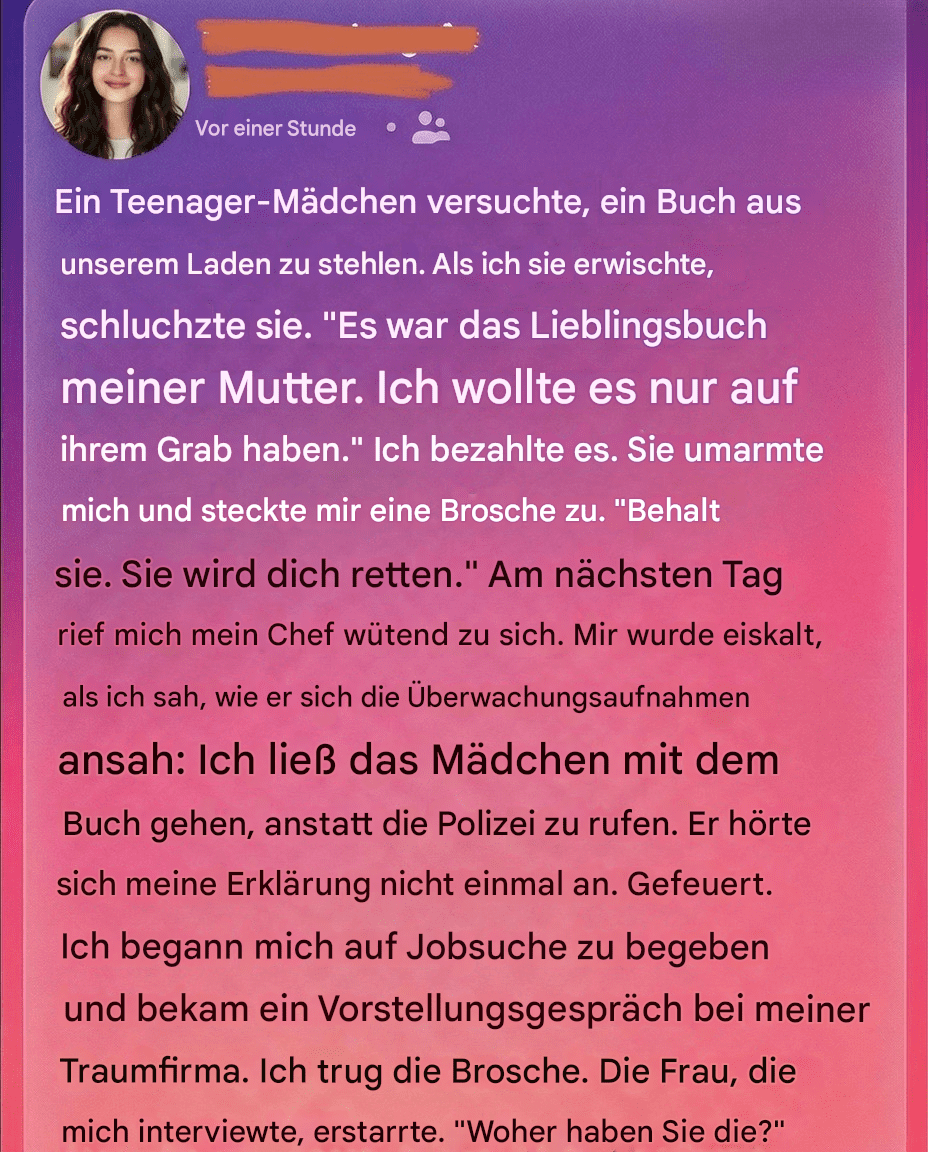 Ich beobachtete sie aus der Ferne, wie sie im Taschenbuchregal stand und mit den Fingern über die Buchrücken strich. Ihre Hände zitterten leicht. Dann steckte sie mit schnellen Bewegungen einen abgenutzten Roman in ihren offenen Rucksack. Mir stockte der Atem. Ich kannte die Regeln des Ladens genau und wusste, was ich tun sollte. Doch als ich auf sie zuging, versuchte sie nicht zu fliehen. Stattdessen erstarrte sie, drehte sich zu mir um, und Tränen traten ihr in die Augen. Mit leiser, zitternder Stimme erklärte sie, dass das Buch das Lieblingsbuch ihrer Mutter gewesen war. Ihre Mutter hatte es ihr jeden Abend vorgelesen, bevor sie krank wurde und im Jahr zuvor gestorben war. Das Mädchen sagte, sie wolle dasselbe Buch als letztes, vertrautes Andenken auf das Grab ihrer Mutter legen. Sie suchte keinen Ärger – sie wollte nur eine Erinnerung bewahren.