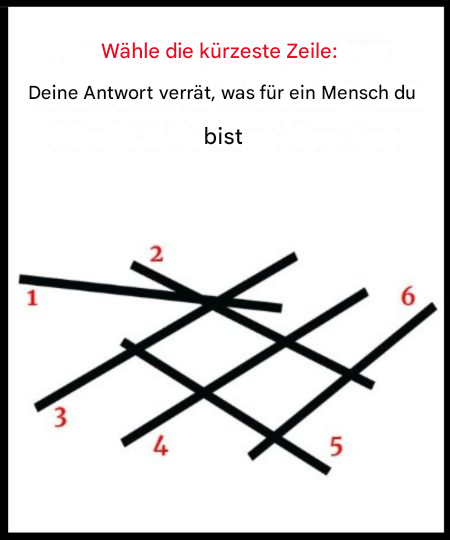 Schau dir das Bild oben an. Es sieht einfach aus, oder? Sechs schwarze Linien, jede von 1 bis 6 nummeriert. Aber hier ist die Herausforderung: Welche Linie erscheint dir am kürzesten? Dieser unterhaltsame Sehtest testet nicht nur dein Sehvermögen, sondern ist eine spielerische Möglichkeit, mehr über deine Persönlichkeit und deine Weltsicht zu erfahren.